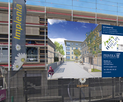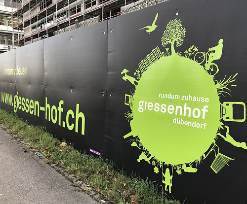 In Dübendorf entsteht ein neues Stadtquartier. Im Auftrag von Bauherrschaft und Totalunternehmer sind wir zuständig für Planung, Produktion und Montage der 500 m2 Bauwerbung. Diese besteht aus freistehenden Baureklamen und am Gerüst befestigten Bautafeln (300 m2) sowie beschrifteten Bauwänden (200 m2).